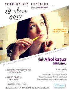 Gracias a la ayuda de Novia Salcedo Fundación y Lanaldi, nace Aholkatuz, un servicio de orientación académica-vocacional dirigido a familias. Cuando los/as alumnos/as entran en la fase de tener que tomar decisiones académicas, la dudas y la incertidumbre aumentan, y es ahí cuando necesitan un apoyo para que pueda acompañarles en el proceso. Las madres y padres suelen ser las personas que acompañan en este proceso, pero también ellos/as tienen dudas y en ocasiones pocas herramientas para poder ayudar de la mejor manera posible. Por todo ello y tras realizar un estudio sobre las necesidades presentes, dimos con la conclusión de que sería muy interesante ofrecer este apoyo para empoderar a la familia.